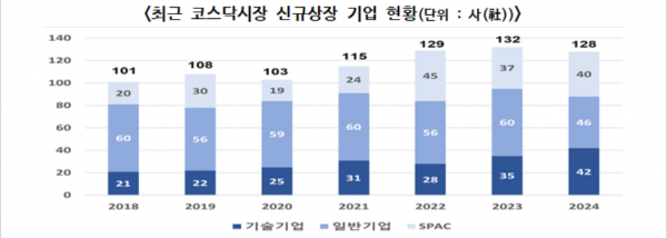 26일 한국거래소에 따르면 올해 코스닥시장 신규상장 기업 수는 128개사로 지난해(132개사)와 유사한 것으로 나타났다. 유형별로는 일반기업 46사, 기술성장특례기업 42사, 기업인수목적회사(SPAC·스팩) 40사를 기록했다.