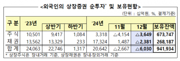 17일 금융감독원이 발표한 '2024년 12월 외국인 증권투자 동향'에 따르면 지난해 12월 외국인은 국내 상장주식 3조6490억원을 순매도했다. 시장별로는 유가증권시장(코스피)에서 3조9770억원을 순매도 했고, 코스닥시장에서 3280억원을 순매수했다.