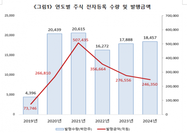 2019년 전자증권제도 시행 이후 2021년까지 전자등록을 통한 발행회사, 발행수량, 발행금액은 지속해서 증가해왔다. 그러다 지난 2022년 처음으로 전년 대비 발행회사, 발행수량, 발행금액이 모두 감소한 데 이어 지난해 3년 연속으로 발행금액, 발행회사가 감소세를 이어가고 있다. 국내외 정치적 리스크 등으로 인해 자본시장이 위축된 영향으로 분석된다.