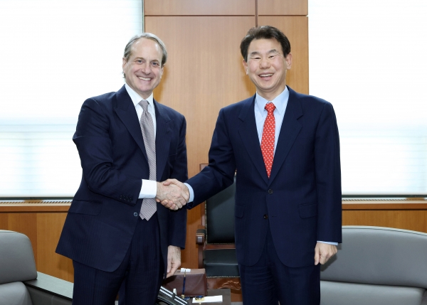 [서울파이낸스 박조아 기자] 정은보 한국거래소 이사장이 24일 오전 서울 여의도 한국거래소 사옥에서 베어 페티트 모건스탠리캐피털인터내셔널(MSCI) 사장 겸 최고운영책임자를 만났다.