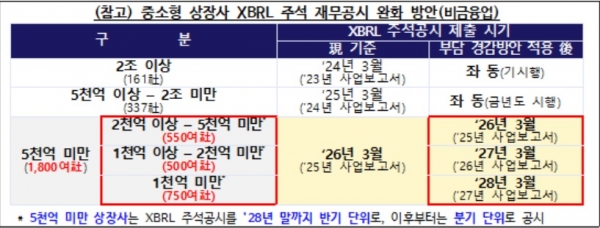 자산 1000억원 이상~2000억원 미만인 500여개사는 제출일이 1년 유예된다. 이에 따라 2026년도 사업보고서부터 XBRL주석 제출이 의무화된다. 자산 1000억원 미만인 약 750여개사는 제출일이 2년 유예 돼, 2027년도 사업보고서부터 XBRL 주석 제출이 의무화된다.