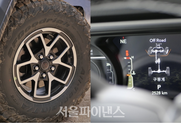 험로 돌파 성능을 끌어올리기 위한 구동 모드(2H, 4H 오토, 4H 파트타임, 4L)도 지원했는데, 시승 구간 대부분은 4L로 주행했다. 4L은 기어 레버를 중립에 둔 상태에서 트랜스퍼 레버를 아래로 끝까지 당겨 쓸 수 있는 모드로, 시속 30킬로미터(km) 이하에서 구동력을 앞뒤축 50대50으로 나눠 강력한 견인력과 접지력을 선사했다. 실제 돌과 나뭇가지가 흩어져 있고, 간헐적으로 깊게 패인 구간이 이어지는 경사로에서 랭글러 41은 침착하게 앞으로 나아갔다.