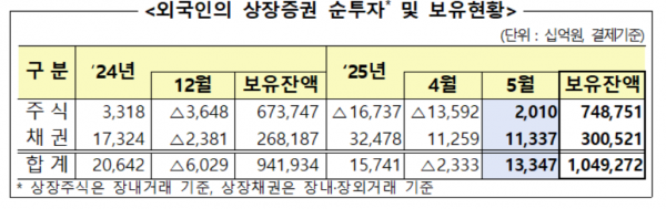 12일 금융감독원이 발표한 '2025년 5월 외국인 증권투자 동향'에 따르면 지난달 외국인은 국내 상장주식 2조100억원을 순매수했다. 5월말 현재 전월 대비 41조7000억원 늘어난 748조8000억원을 보유하고 있다.