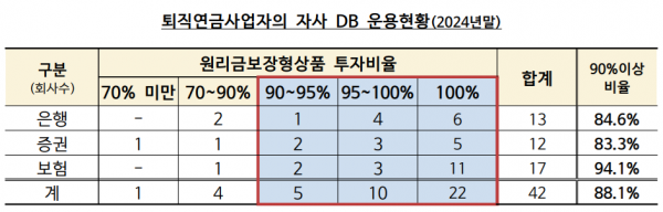 금감원 조사에 따르면 총 42개 퇴직연금사업자 중 88.1%가 자사 DB 적립금의 90% 이상을 원리금보장형 상품에 운용하고 있었다. 수익률도 4.37%로 DB제도 전체 평균과 유사했다.