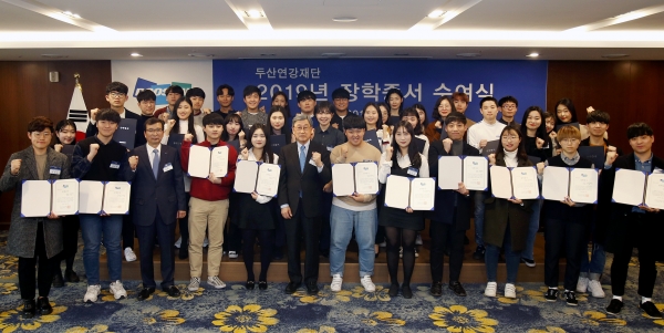 두산연강재단은 지난 25일 서울 중구 스카이파크호텔동대문에서 '2019년 두산연강재단 장학증서 수여식'을 열고 학생들에게 장학금을 전달했다.