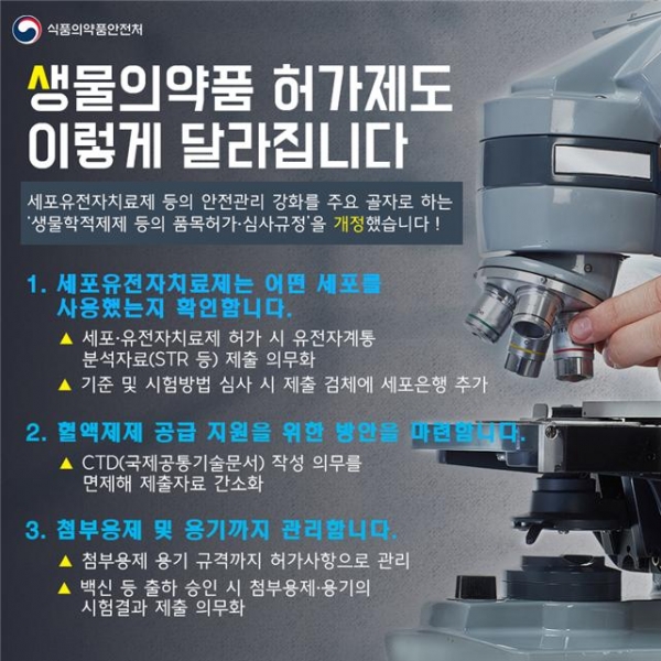 개정에 따라 앞으로 세포·유전자치료제는 특정 세포를 배양해 저장하는 세포은행 구축 및 운영과정에서 세포의 일관성을 확인할 수 있는 유전자 계통 분석 결과를 제출해야 한다.