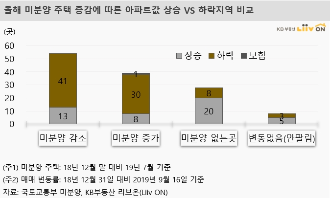 27일 KB부동산 리브온이 국토교통부 미분양 주택 자료를 바탕으로 지난해 말 대비 미분양 증감 지역의 아파트 매매가격을 분석한 결과 미분양 주택은 129개 지자체 중 54곳에서 감소했으며 미분양 주택이 줄어든 지역 중 75%인 41곳의 아파트값은 마이너스를 기록했다. 미분양 주택이 일부 해소됐지만 아파트 매매시장에는 긍정적인 영향을 주지 못하는 상황이다.