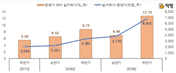 2019년 하반기 수도권 입주 1년 미만 아파트의 매매거래가격은 분양가에 비해 1억2857만원(20.22%) 상승한 가격에 거래됐다. 2019년 상반기는 분양가 대비 7326만원 상승했으나 하반기에 매매거래가격이 급등하면서 큰 폭으로 올랐다.
