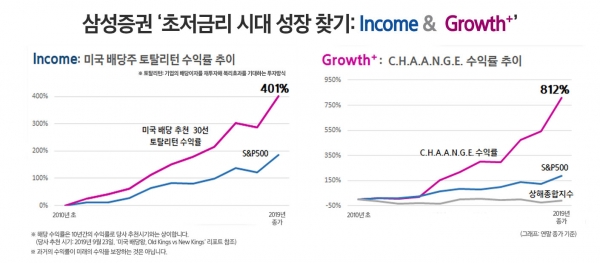 삼성증권 관계자는 "지난 9월 삼성증권에서 추천한 배당왕 추천종목 30선 (기존 '배당왕' 중 선별된 15개 종목과 향후 배당왕이 될만한 15개 종목)의 경우, 2010년에서 2019년까지 10년간의 투자 수익률이 평균 401%에 달해 같은 기간 미국 스탠더드앤드푸어스500(S&P500)지수의 상승률 187%의 2배가 넘는 것으로 나타났다"고 설명했다.