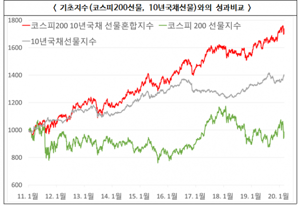 저금리 기조가 지속됨에 따라 주식보다 향후 가격 상승이 기대되면서도 변동성이 낮은 10년국채선물의 비중을 높여 안정성과 수익성을 높이는 지수라는 게 한국거래소의 설명이다.