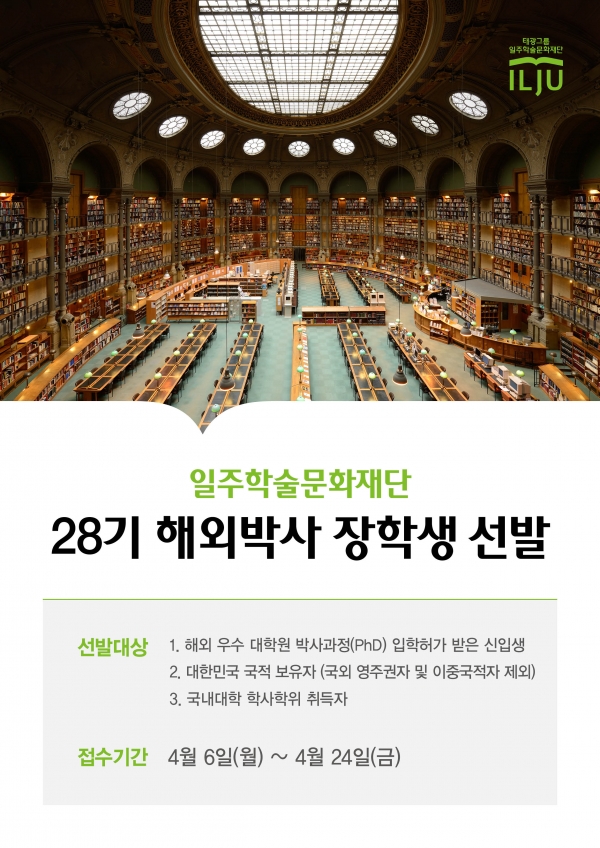 신청 기간은 이날부터 24일까지 3주간이며, 1·2차 서류심사와 면접을 거쳐 6월 중 합격자를 발표한다. 제출서류는 장학금 지원신청서, 입학허가서, 추천서 등이다. 접수는 일주재단 홈페이지에서 할 수 있다.