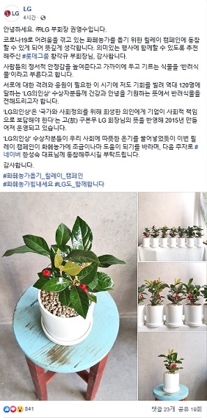 권 부회장은 이어 "LG 의인상 수상자분들이 사회에 따뜻한 온기를 불어넣었듯이 이번 릴레이 캠페인이 화훼농가에 조금이나마 도움이 되길 바란다"며 다음 주자로 한성숙 네이버 대표를 지명했다.