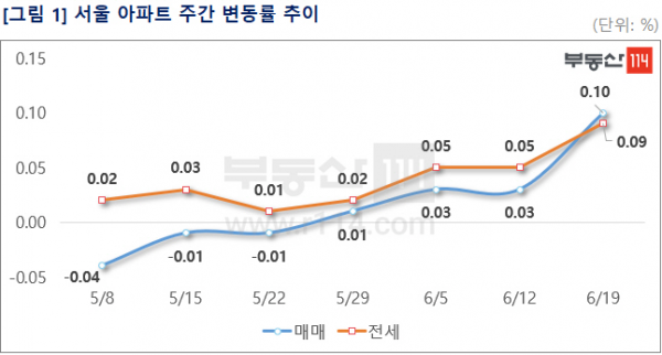 20일 부동산114에 따르면 서울 아파트 매매가격은 0.1% 상승했다. 재건축 아파트와 일반 아파트가 각각 0.15%, 0.09% 올라 전주 대비 상승폭이 커졌다.