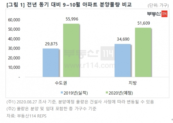 31일 부동산114에 따르면 올해 9~10월 전국 분양예정 아파트 물량은 총 10만7605가구(임대 포함, 총 가구수 기준)로 조사됐다. 권역별로는 수도권 5만5996가구, 지방 5만1609가구가 공급될 전망이다. 지난해 동기 6만4565가구(수도권 2만9875가구, 지방 3만4690가구) 분양 실적에 비하면 1.5배 이상 많은 수준이다.