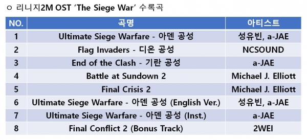 △엔씨사운드가 작곡한 Flag Invaders(깃발 침략자들) △관악기 연주가 돋보이는 End of the Clash(치열함의 끝) △트레일러 음악 작곡가 Michael J. Elliott이 원작 리니지2의 OST를 리메이크한 Battle at Sundown2(황혼의 전투2) △Final Crisis2(최후의 위기) 등도 수록됐다.