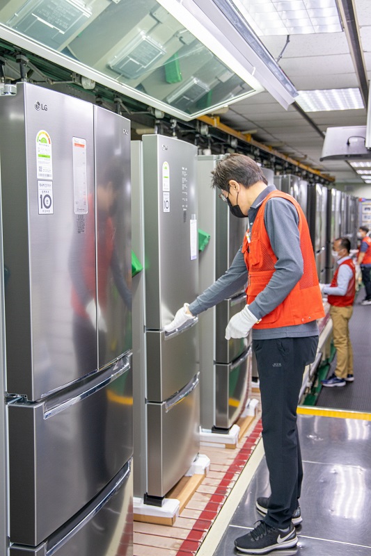 [서울파이낸스 오세정 기자] LG전자 직원이 16일 경남 창원시에 있는 냉장고 생산라인에서 'LG 디오스 김치톡톡' 스탠드형 모델을 생산하고 있다.