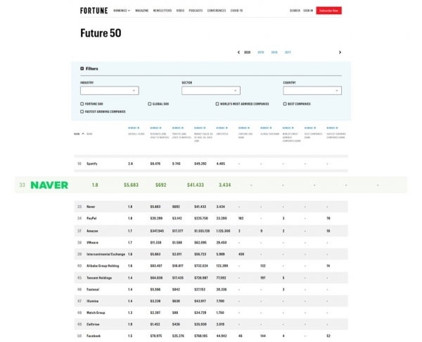 [서울파이낸스 이호정 기자] 네이버가 글로벌 경제지 포춘이 선정하는 '미래유망기업(The Future 50)' 기업 33위에 올랐다고 4일 밝혔다. 한국 기업 중에는 네이버와 셀트리온(49위) 두 곳이 선정됐다.