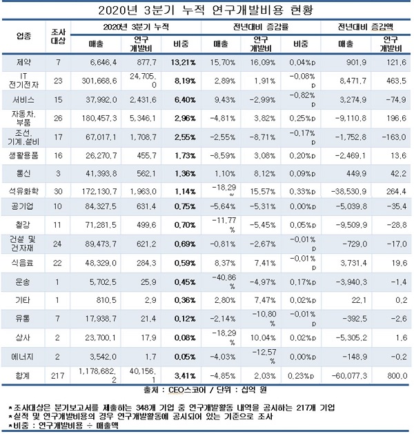 9일 기업평가사이트 CEO스코어가 국내 500대 기업 중 분기보고서를 통해 R&D 투자 금액을 공시하는 217개 기업을 조사한 결과 3분기 누적 투자액은 총 40조1561억원으로 작년 동기보다 2.03%(8000억원) 증가했다.