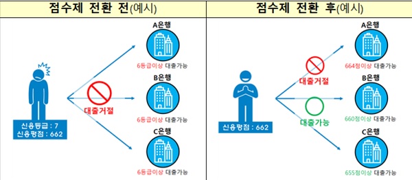 기존의 신용등급제는 신용도가 유사했음에도 등급에 따라 획일적으로 대출이 거절된다는 지적이 있었다. 예를 들어, 신용점수가 7등급 상위인 사람과 6등급 하위인 사람은 신용도가 비슷했음에도 7등급인 사람이 대출 심사 시 불이익을 받는 경우가 있었다. 이를 개선하고자 등급제가 아닌 점수제를 도입하게 된 것이다.