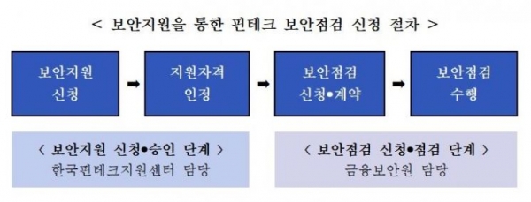 금융위원회가 중소 핀테크 기업의 보안점검 비용의 75%를 지원함에 따라 금융보안원은 금융 테스트베드·오픈뱅킹에 참여하거나 온라인투자연계금융업자로 등록하는 중소 핀테크 기업을 대상으로 핀테크 기업 보안점검과 핀테크 서비스 취약점 점검 비용을 지원한다.
