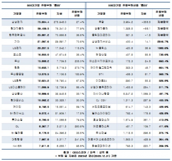 같은 기간 이들 기업의 자본은 전년보다 3.3%(46조1692억원) 늘었으며, 부채비율은 105.8%를 기록해 전년(103.7%)보다 높아졌다. 2019년 769조5757억원이던 차입금 총액이 지난해 810조8436억원으로 5.4%(41조2679억원)가 늘며 부채가 증가했다.