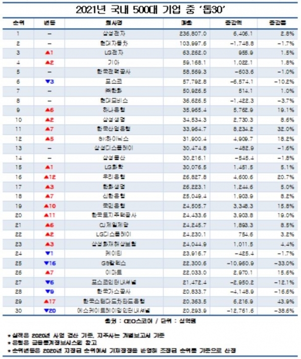 한국전력(5위)과 한화(7위), 현대모비스(8위) 등은 전년도 자리를 지켰고 금융업 성장에 힘입어 하나은행과 삼성생명은 각각 9, 10위로 '톱10'에 신규 진입했다. 반도체 기업인 SK하이닉스(31조9000억원)는 5계단 상승해 12위로 올라섰다.