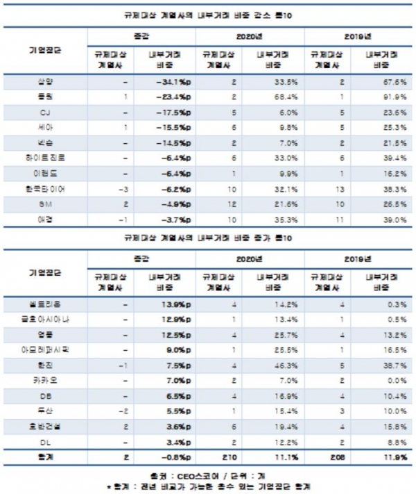 전체 매출에서 내부거래에 따른 매출이 차지하는 비중도 2019년 12.5%에서 2020년 11.7%로 0.8%포인트 낮아졌다.