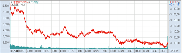 28일 코스피지수는 전 거래일 대비 35.72p(1.14%) 내린 3097.92에 마감했다. 지수는 전장보다 0.24p(0.01%) 하락한 3133.40 출발한 이후 하락흐름을 지속했다. 코스피 종가가 3100선 아래로 떨어진 것은 지난 8월 23일(3090.21) 이후 약 한 달 만이다.