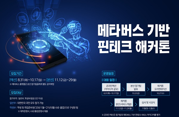 이번 대회는 '메타버스 환경에서 핀테크(또는 블록체인 핀테크) 서비스 개발'을 주제로 한다. △온라인 예선 △본선 참가팀 선발 심사 △메타버스 플랫폼 사전교육 △해커톤 본선 △시상식 순으로 진행될 예정이다.