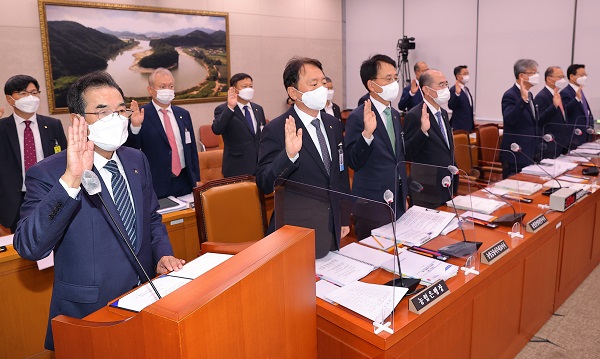 이날 이 의원이 "대장동 사업의 리스크가 높다고 생각하느냐"는 질문에도 손병환 회장은 "현재 기준으로는 높아 보이지 않는다"고 답했다.