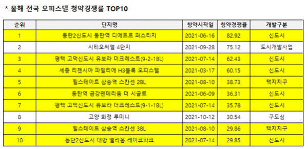 3위를 기록한 '평택 고덕신도시 유보라 더크레스트(9-2-1BL)'는 평균 62.43대 1의 경쟁률을 보였고, 세종시 '세종 리첸시아 파밀리에 H3블록 오피스텔'은 평균 60.15대 1의 경쟁률을 기록했다.