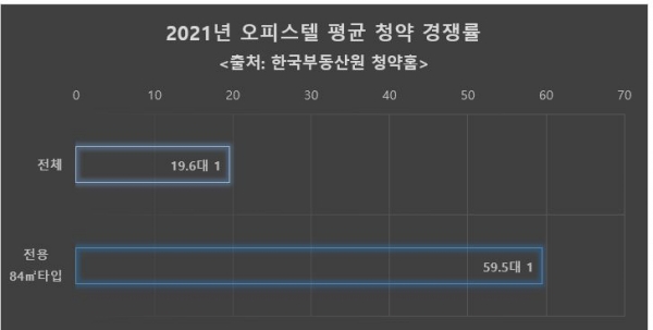 올해 1월부터 11월까지 건설사들은 전용 84㎡타입 오피스텔을 총 18곳에 6890실을 공급했으며 총 40만7693건의 청약이 이뤄져 평균 59.5대 1의 경쟁률을 기록했다. 올해, 오피스텔 평균 경쟁률(1~11월)인 19.6대 1을 크게 웃도는 수치다.