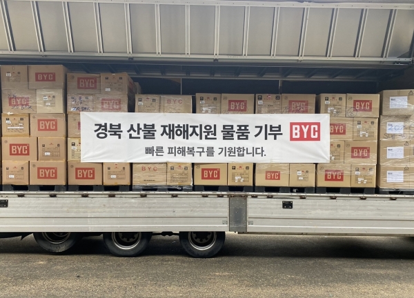 BYC 측은 "동해안 일대에서 발생한 산불로 피해를 입은 지역 주민과 현장을 복구하기 위해 애쓰는 관계자분에 조금이나마 도움이 되고자 물품을 전달하게 됐다"며 "하루빨리 주민들이 일상을 되찾을 수 있기를 바란다"고 말했다.