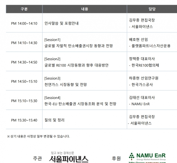 믿고 보는 경제신문 서울파이낸스가 주최하고 NAMU EnR가 후원하는 이번 행사는 △글로벌 자발적 탄소배출권시장 동향과 전망(배호현 선임/플랫폼파트너스자산운용) △글로벌 RE100 시장동향과 향후 대응방안(정택중 대표이사/한국RE100협의체) △천연가스 시장동향 및 전망(하종현 선임연구원/ 한국가스공사) △한국-EU 탄소배출권 시장동조화 분석 및 전망(김태선 대표이사/NAMU EnR) 등의 주제발표가 이어집니다.