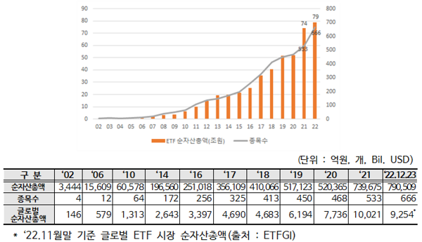 26일 한국거래소는 이같은 내용이 담긴 '2022년 ETF·ETN시장 결산 및 주요 특징 분석'을 발표했다. 이에 따르면 국내 ETF 순자산총액은 지난달 24일 80조원을 돌파했고, 이달 1일 기준 82조7000억원으로 사상 최고치를 기록했다.