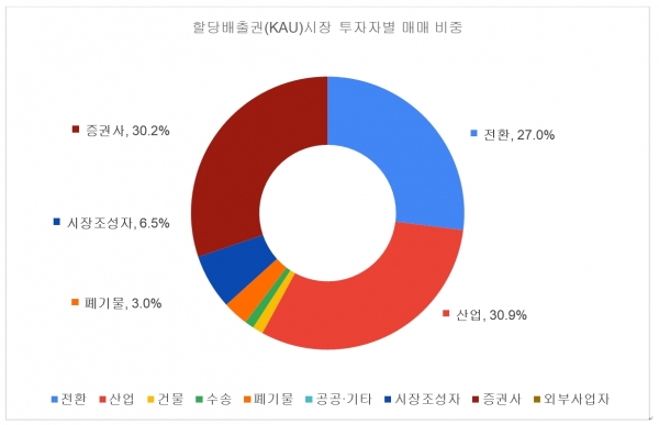 2022년 8월부터 할당배출권(KAU)시장에 대한 투자자별 매매동향 정보가 공개됨에 따라 주요 현황을 살펴보면 산업무문의 매도 물량을 전환부문에서 소화하는 가운데 미스-매칭 나는 물량에 대해서는 증권사가 유연하게 매수-매도 포지션으로 대응하고 있어 예전 보다는 시장 유동성은 상당히 개선되고 있는 모습을 보이고 있다.