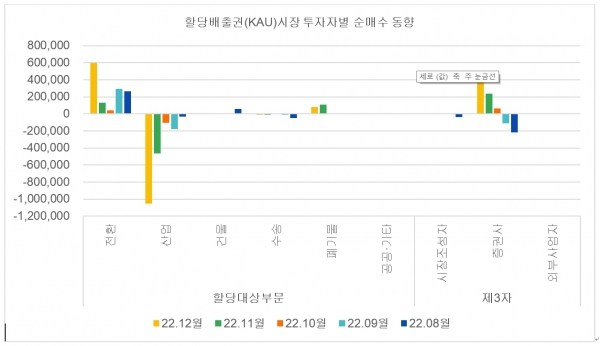 탄소배출권시장이 공식적으로 개장한지 8년만에 투자자별 매매동향 데이터가 공개됐다. 분석 가능하도록 공개된 실질적 상세 데이터는 2022년 8월부터 매매동향 데이터가 공개되었는데 분석 결과, 산업부문의 경우 2022년 8월부터 매도 우위를 보였고 누적 순매도 규모는 2022년 12월말 현재, 183만768 KAU를 순매도했다. 이 과정에서 할당배출권(KAU) 가격은 40.1% 급락하며 할당배출권(KAU) 가격 하락을 견인했다.