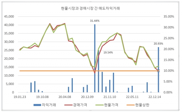 2023년 1월 11일, 경매결과를 이용하여 실현 가능한 매도차익거래를 살펴보면, 무상할당 배출권 10 KAU22년물(매입 단가 제로) 받고 유상할당 배출권(경매) 10 KAU22년물(낙찰가격 톤당 12,900원)을 매입한 뒤 현물시장에서 20 KAU년물(톤당 15,600원)에 매도할 경우 무위험 매도차익거래의 수익률은 141.86%에 달한다.