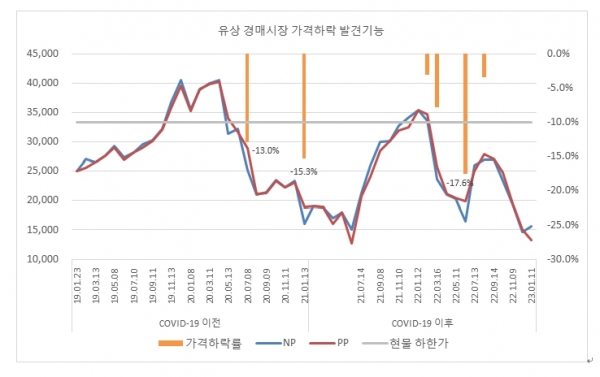 경매시장의 가격발견기능을 분석한 결과, 초과수요 국면에서 상승추세를 지속적으로 연출한 국면은 전무한 반면, 낙찰가격을 중심으로 하락 추세가 일정기간 유지된 경우는 총6회에 걸쳐 관찰되었다. 코로나19 이전에는 2회, 코로나19 이후에는 4회에 걸쳐 하락추세가 유지되는 가격하락발견 기능이 감지됐다.