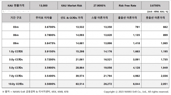 ø 서울파이낸스와 NAMU EnR 금융공학 & 리서치센터에서는 매주 월요일 탄소배출권 장외파생상품(선도 및 스왑, 옵션) 이론가격을 산정, 발표하고 있습니다. 본 자료는 NAMU EnR 저작물로 모든 저작권은 당사에게 있으며 신뢰할 만한 데이터 및 통계 기법을 이용하여 산정된 자료로 그 정확성이나 완전성을 보장할 수 없습니다. 따라서 고객의 투자결과에 대한 법적 책임소재 및 그에 대한 증빙자료로 사용 될 수 없으며 무단 전재, 복사, 재배포를 엄격히 금지합니다.