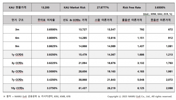 ø 서울파이낸스와 NAMU EnR 금융공학 & 리서치센터에서는 매주 월요일 탄소배출권 장외파생상품(선도 및 CCfDs, 스왑, 옵션) 이론가격을 산정, 발표하고 있습니다. 본 자료는 NAMU EnR 저작물로 모든 저작권은 당사에게 있으며 신뢰할 만한 데이터 및 통계 기법을 이용해 산정된 자료로 그 정확성이나 완전성을 보장할 수 없습니다. 따라서 고객의 투자결과에 대한 법적 책임소재 및 그에 대한 증빙자료로 사용 될 수 없으며 무단 전재, 복사, 재배포를 금지합니다.