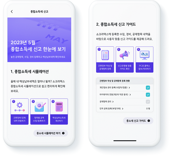 소크라택스 앱은 등록한 수입과 경비, 공제항목 내역을 바탕으로 맞춤형 절세 가이드를 제공한다. 또 국세청 홈택스 신고 화면을 그대로 구현해 쉽게 따라 할 수 있도록 했다. '절세 바이블' 메뉴에선 매주 다양한 세테크 정보를 확인할 수 있다.