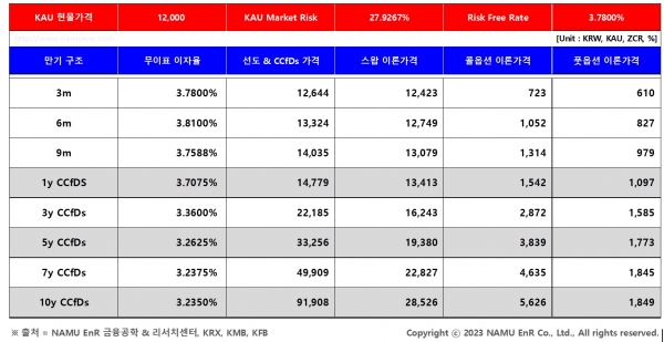 ø 서울파이낸스와 NAMU EnR 금융공학 & 리서치센터에서는 매주 월요일 탄소배출권 장외파생상품(선도 및 CCfDs, 스왑, 옵션) 이론가격을 산정, 발표하고 있습니다. 본 자료는 NAMU EnR 저작물로 모든 저작권은 당사에게 있으며 신뢰할 만한 데이터 및 통계 기법을 이용하여 산정된 자료로 그 정확성이나 완전성을 보장할 수 없습니다. 따라서 고객의 투자결과에 대한 법적 책임소재 및 그에 대한 증빙자료로 사용 될 수 없으며 무단 전재, 복사, 재배포를 엄격히 금지합니다.