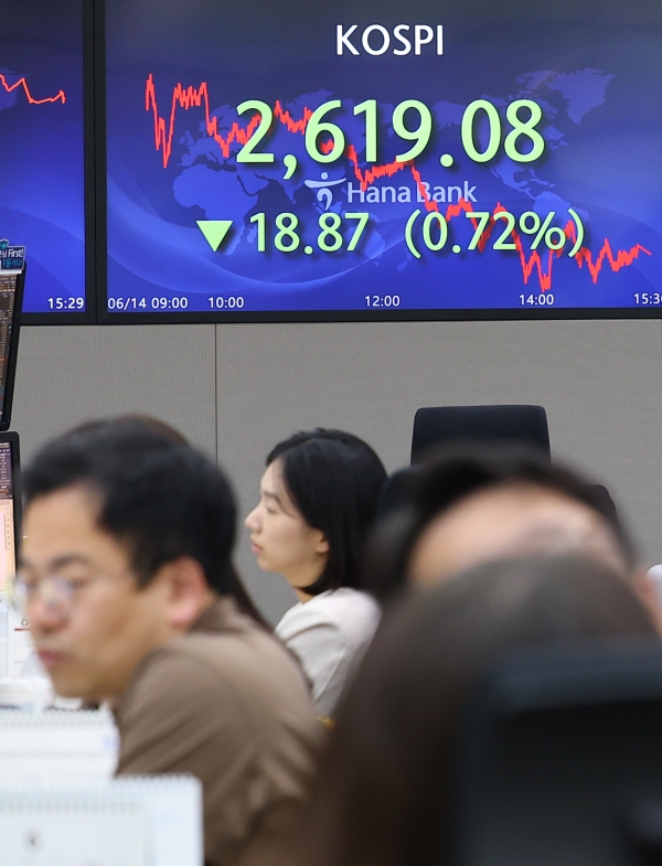 14일 코스피지수는 전 거래일 대비 18.87p(0.72%) 내린 2619.08에 마감했다. 지수는 전장보다 2.86p(0.11%) 오른 2640.81에 출발한 이후 하락 마감했다.