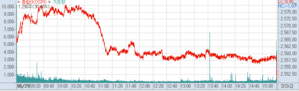 29일 코스피지수는 전 거래일 대비 14.17p(0.55%) 내린 2550.02에 마감했다. 지수는 전장보다 0.17p(0.01%) 하락한 2564.02에 출발한 이후 하락흐름을 지속했다.