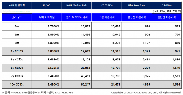 ø 서울파이낸스와 NAMU EnR 금융공학 & 리서치센터에서는 매주 월요일 탄소배출권 장외파생상품(선도 및 CCfDs, 스왑, 옵션) 이론가격을 산정, 발표하고 있습니다. 본 자료는 NAMU EnR 저작물로 모든 저작권은 당사에게 있으며 신뢰할 만한 데이터 및 통계 기법을 이용하여 산정된 자료로 그 정확성이나 완전성을 보장할 수 없습니다. 따라서 고객의 투자결과에 대한 법적 책임소재 및 그에 대한 증빙자료로 사용 될 수 없으며 무단 전재, 복사, 재배포를 엄격히 금지합니다.