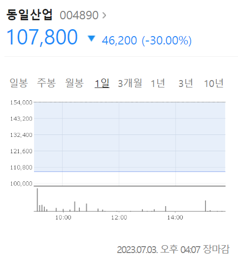 3일 동일산업은 전거래일 대비 4만6200원(30.00%) 하락한 10만7800원에 장을 마감했다. 동일금속(-29.95%), 대한방직(-29.92%), 방림(-29.94%) 등도 줄줄이 떨어졌다. 만호제강(-10.59%)은 하한가는 피했다.