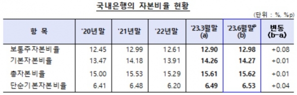 금감원 관계자는 "국내은행의 자본비율은 전분기말 대비 소폭 상승했고, 모든 은행의 자본비율이 규제비율을 상회하는 등 양호한 수준을 유지했다"면서도 "최근 환율·금리가 상승하는 등 금융시장 불확실성이 여전하고 중국 부동산 경기 부진 등 대내외 경제여건도 악화되고 있는 만큼 충분한 자본여력을 확보할 필요가 있다"고 말했다.