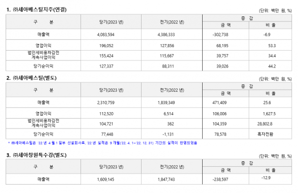 세아베스틸은 별도 기준 2023년 매출 2억3107억원, 영업이익 1125억원을 기록했다. 이는 전년 대비 각각 25.6%, 1627.5% 증가했다. 또 세아창원특수강은 매출 1조6091억원, 영업이익 660억원을 기록했다. 이는 전년 대비 각각 12.9%, 42.8%감소했다.