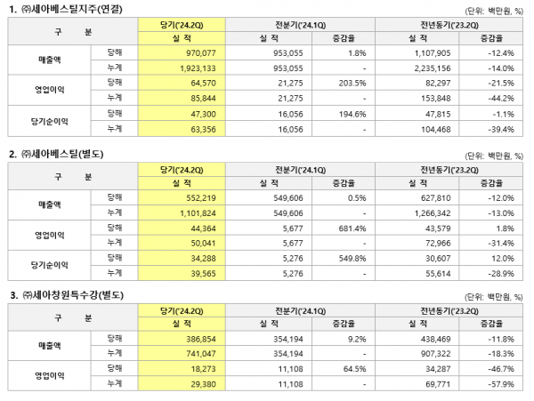 사업별로 세아베스틸은 건설, 중장비, 산업기계 등 특수강 수요산업의 업황 둔화로 판매량은 감소했으나, 원가 절감 및 수익성 개선 노력 등으로 전년 동기 대비 영업이익 1.8% 증가했다.